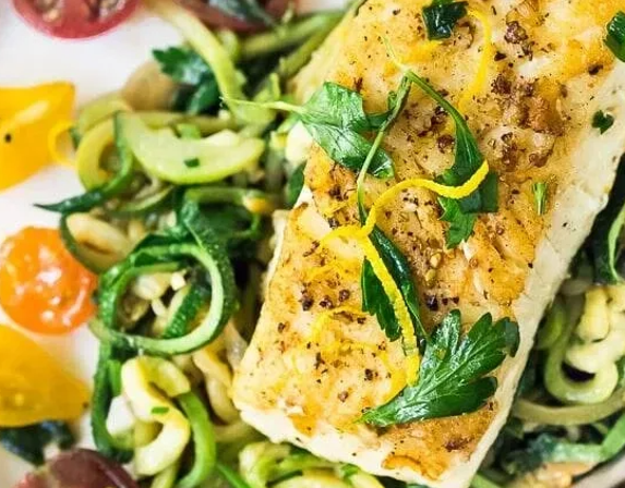 - In a Large Skillet, heat oil and add shallots and garlic for about 3 minutes. Add courgette noodles and season with salt and pepper. Sauté noodle for 4 minutes. Toss in lemon zest, fresh parsley and a squeeze of lemon. Taste for salt and lemon and adjust if necessary. Divide among two bowls and top with the halibut.